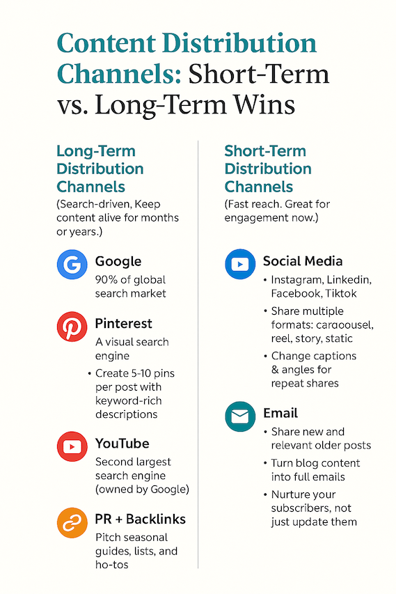 Pinterest – It’s not just a social platform. It’s a visual search engine. You can create 5–10 pins for one blog post using different images and keyword-rich descriptions. And those pins live for months, not days like social. This is part of why repurposing content is such a valuable skill.